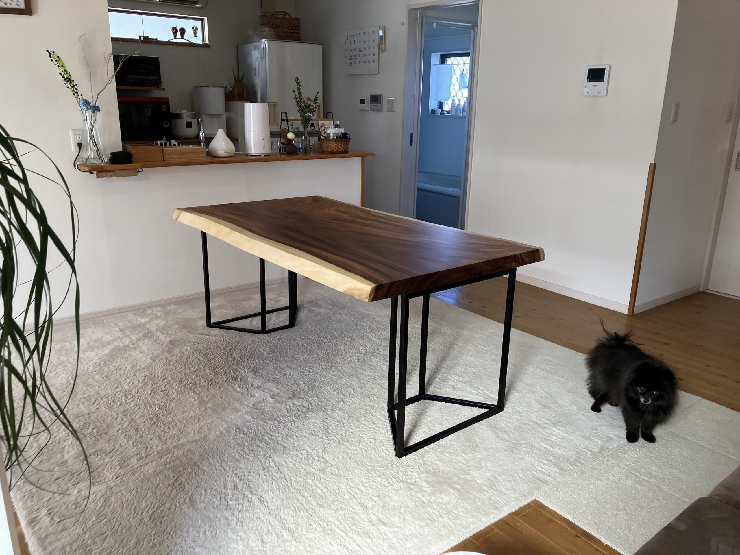 モンキーポッド無垢材のダイニングテーブルをお届けしました。1600×950ミリの大判の天板は、厚みも58ミリという大迫力の一枚。握り込んだ時の圧倒的な質量感は、製材された材料を用いた天板とは一線を画しています。脚部には細身の部材を組み合わせて強度を出したスチール脚をお選びいただき、スタイリッシュな印象に仕上がりました。