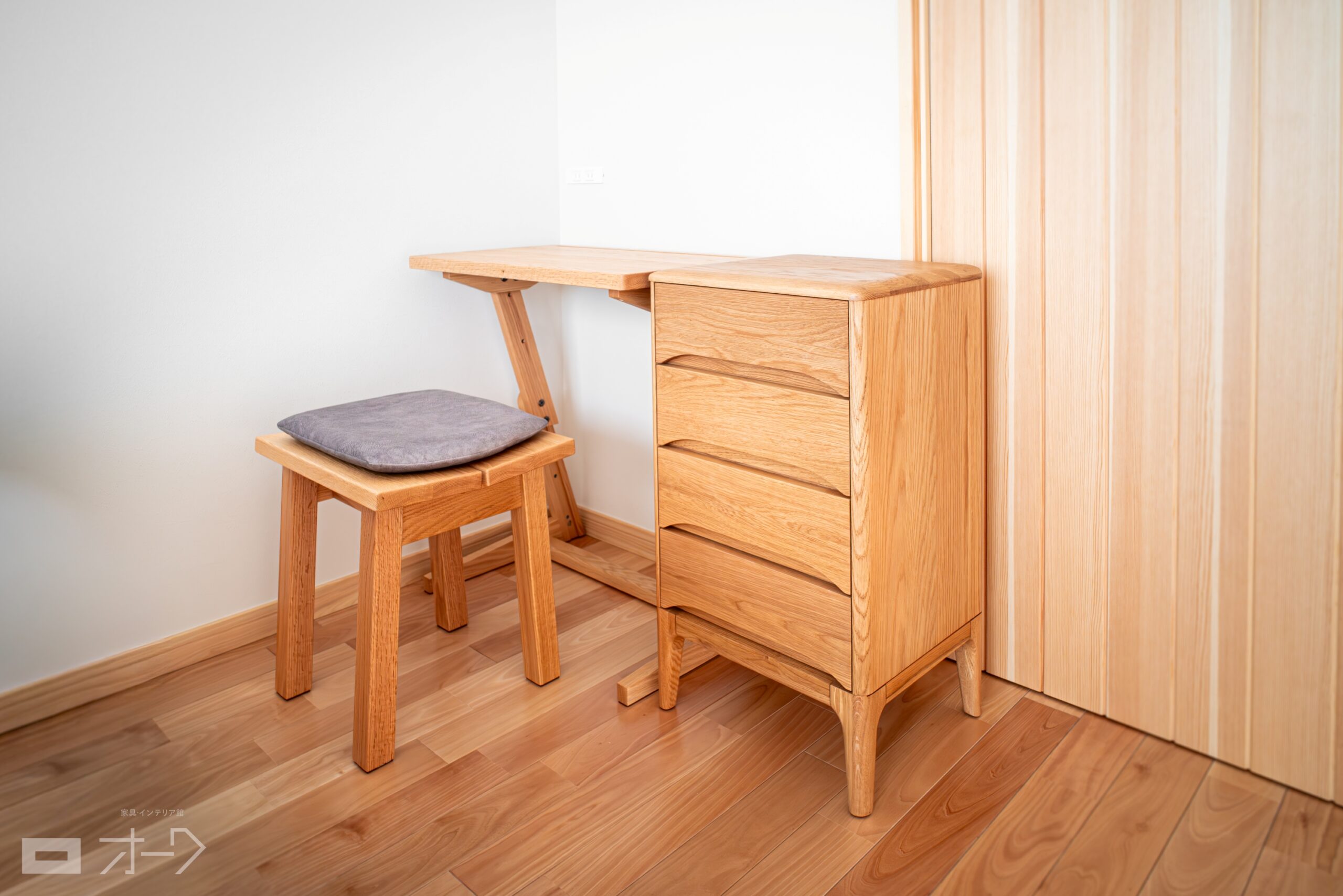 アルダー無垢材のデスクセットをお届けしました。淡い色合いと滑らかな木肌が特長的な、やさしい印象に仕上がったデスクです。サイドキャビネットも合わせてお選びいただき、大人向けの作業デスクとして活躍してもらえる組み合わせになりました。