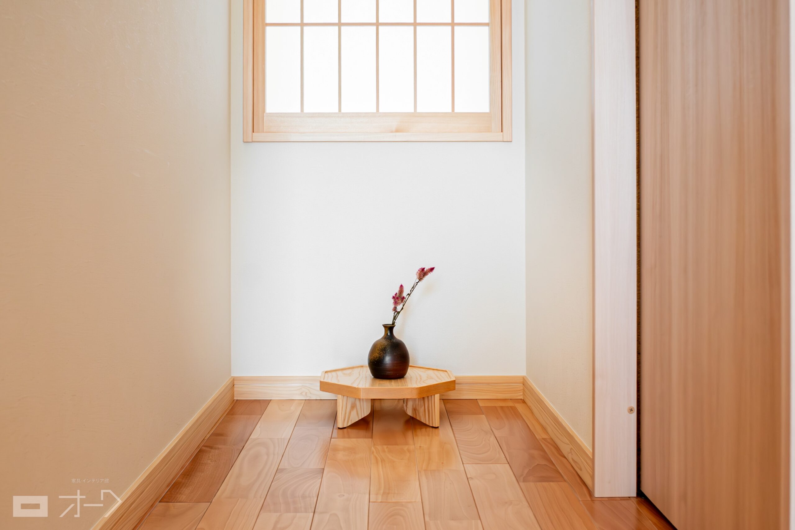 アイキャッチとなるスペースには、オーク(ナラ)無垢材のお盆もお選びいただきました。シンプルなデザインの小ぶりな家具ですが、それゆえに品質の良さが際立ちます。季節のお花や、お気に入りの小物などをディスプレイするのも、粋なインテリアを楽み方ですね。