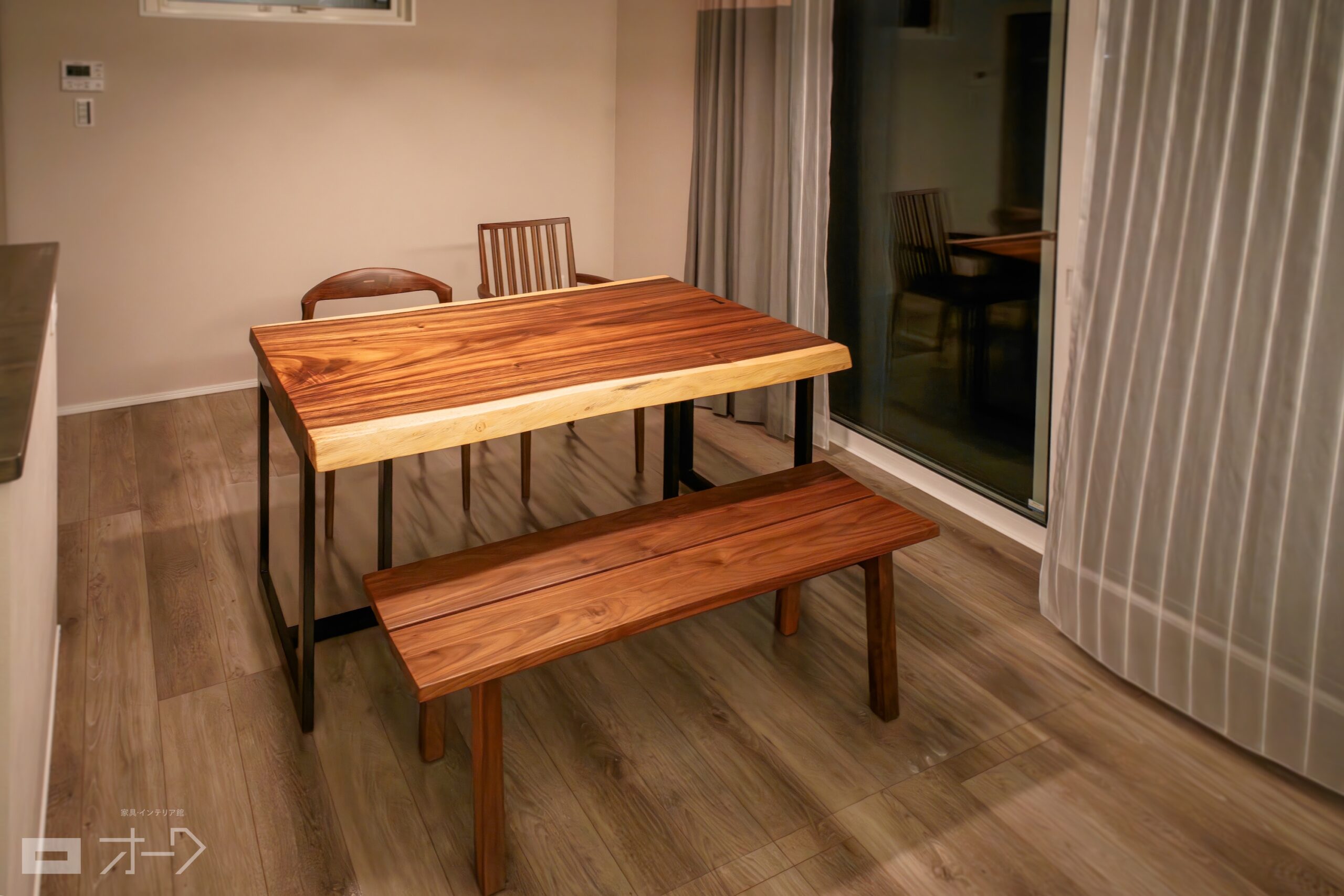 モンキーポッド一枚板のダイニングセットをお届けしました。さまざまな色合いが交錯するモンキーポッドは、一枚板らしさが楽しめる人気の材質です。椅子とベンチは暗めの色合いに合わせてブラックウォールナット無垢材でお選びいただきました。色合いと造形にほどよいリズム感が生まれる、天然木ならではの楽しみ方が存分に詰まったダイニングセットに仕上がりました。