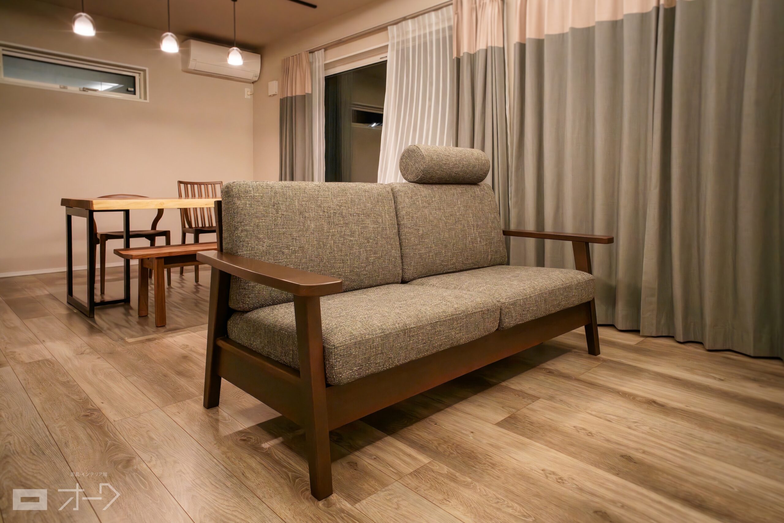リビングスペースには、ブラックウォールナット無垢材のソファをお選びいただきました。フレームの素材は椅子・ベンチと統一させつつ、カバーは色味を加えずに暗めのグレーで落ち着いた印象に仕上がっており、ニュアンスカラーの効いた空間によく馴染んでいます。