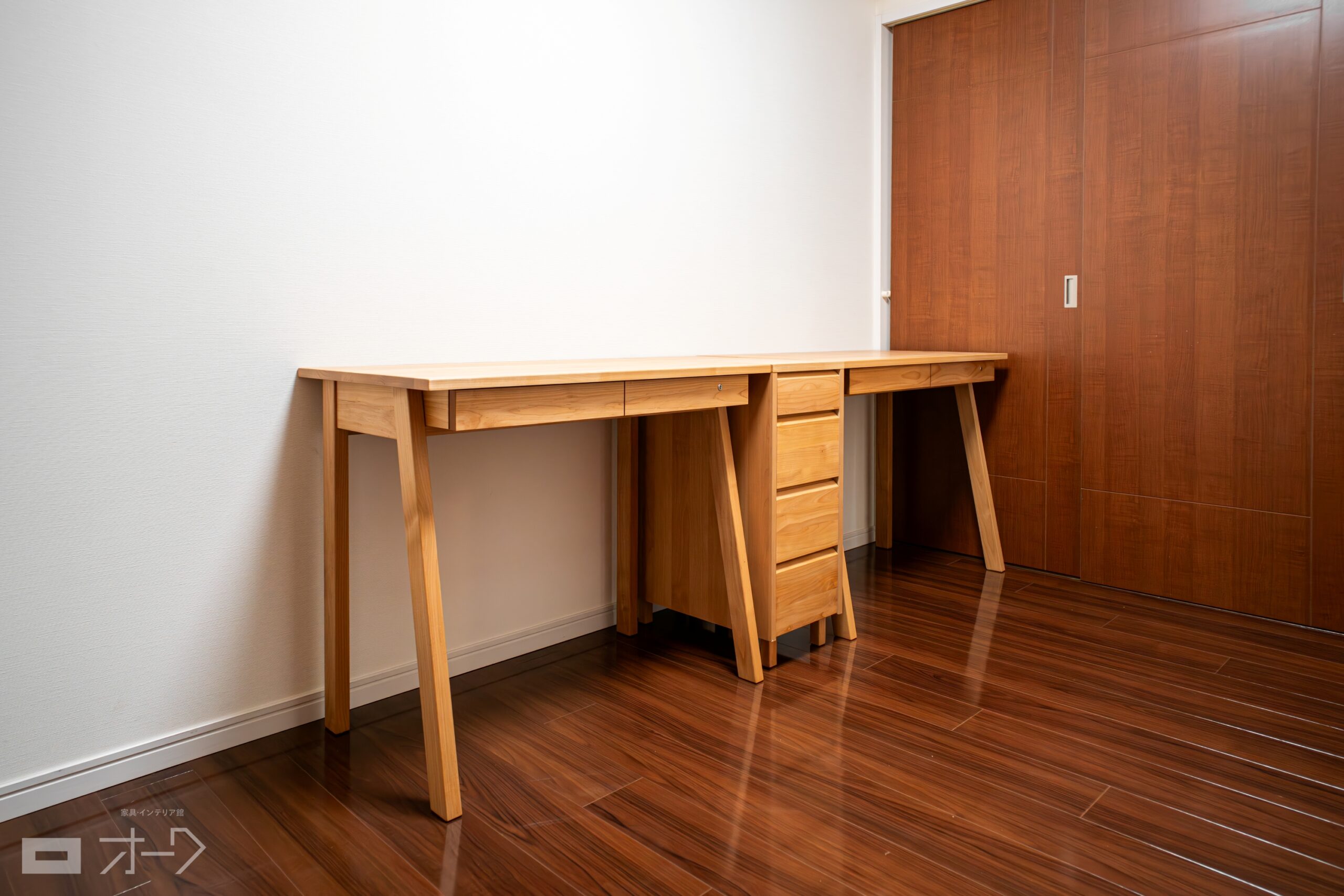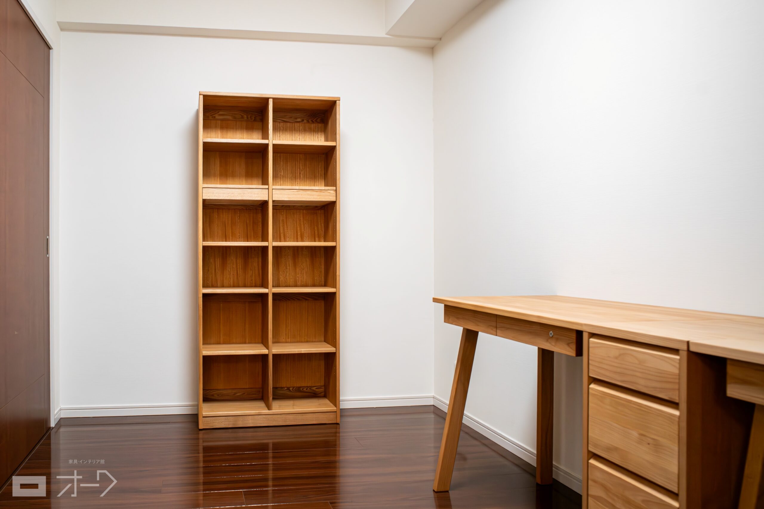 アルダー無垢材のデスクセットと、タモ(アッシュ)本棚をお届けしました。デスクにはサイドキャビネットを合わせていただき、天板面の横幅を約2400㎜確保しつつ、収納力も大幅にアップしている仕様です。本棚も明るい色合いで統一して、蔵書や書類を整理整頓しながら集中して過ごせる空間になりました。