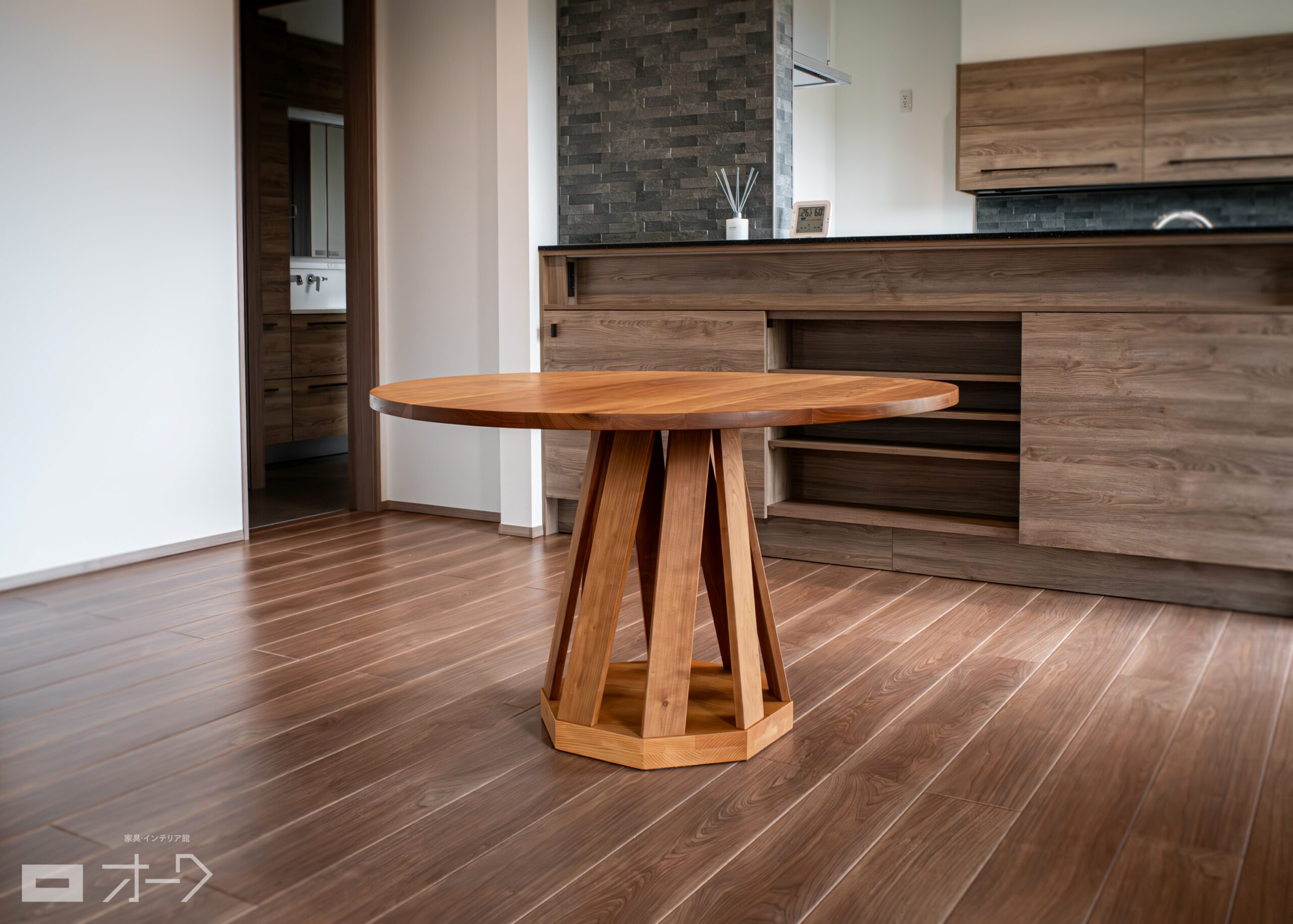 ブラックチェリー無垢材の丸テーブルをお届けしました。直径1200㎜の大判サイズの天板を、無垢材をふんだんに使ったデザイン性に富む脚が支えます。テーブルの周囲を自由に使える機能性もありながら、見た目にも美しい唯一無二の仕上がりになりました。