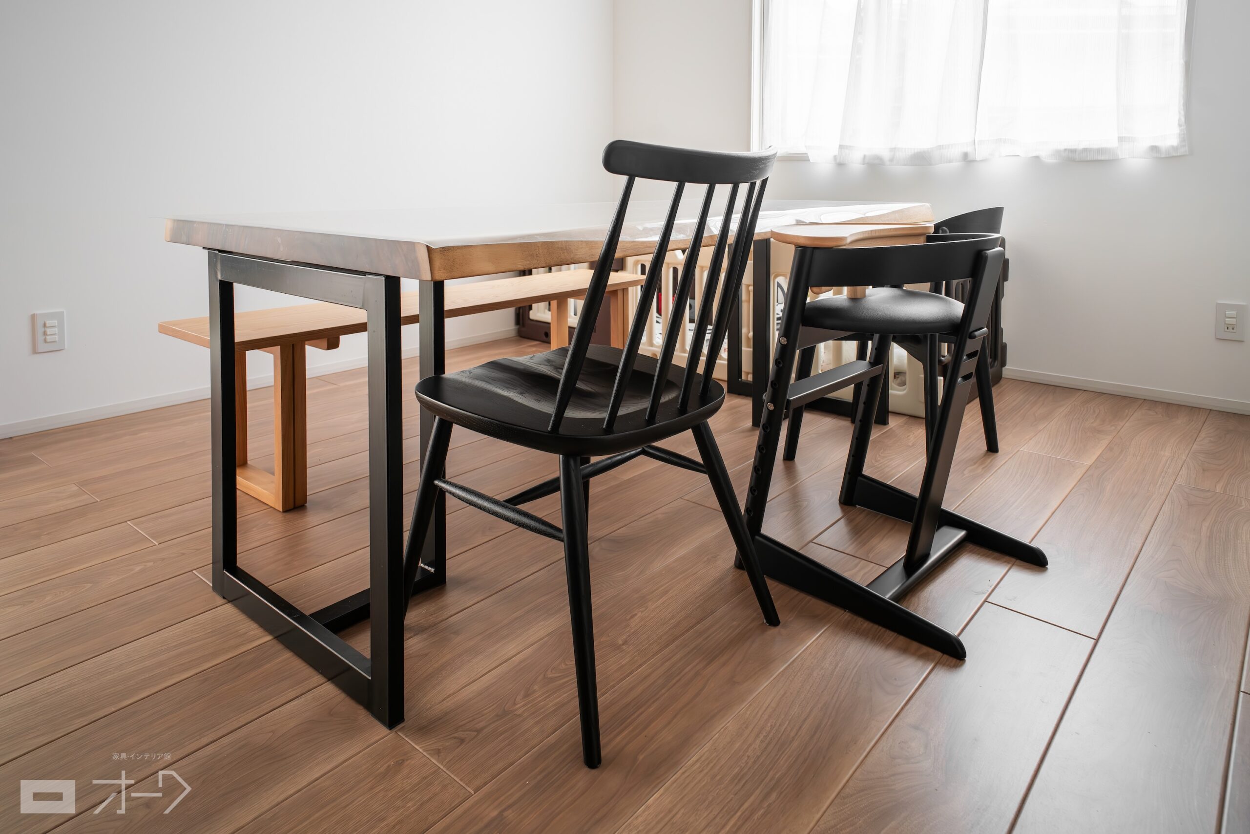 オーク(ナラ)無垢材をブラック塗装で仕上げたダイニングチェア・キッズチェアをお届けしました。以前お求めいただいた一枚板に合わせて、キリッと引き締まった印象がとても格好良い組み合わせになりました。デザインを統一せず、リズム感のあるセッティングになっているのもポイントです。
