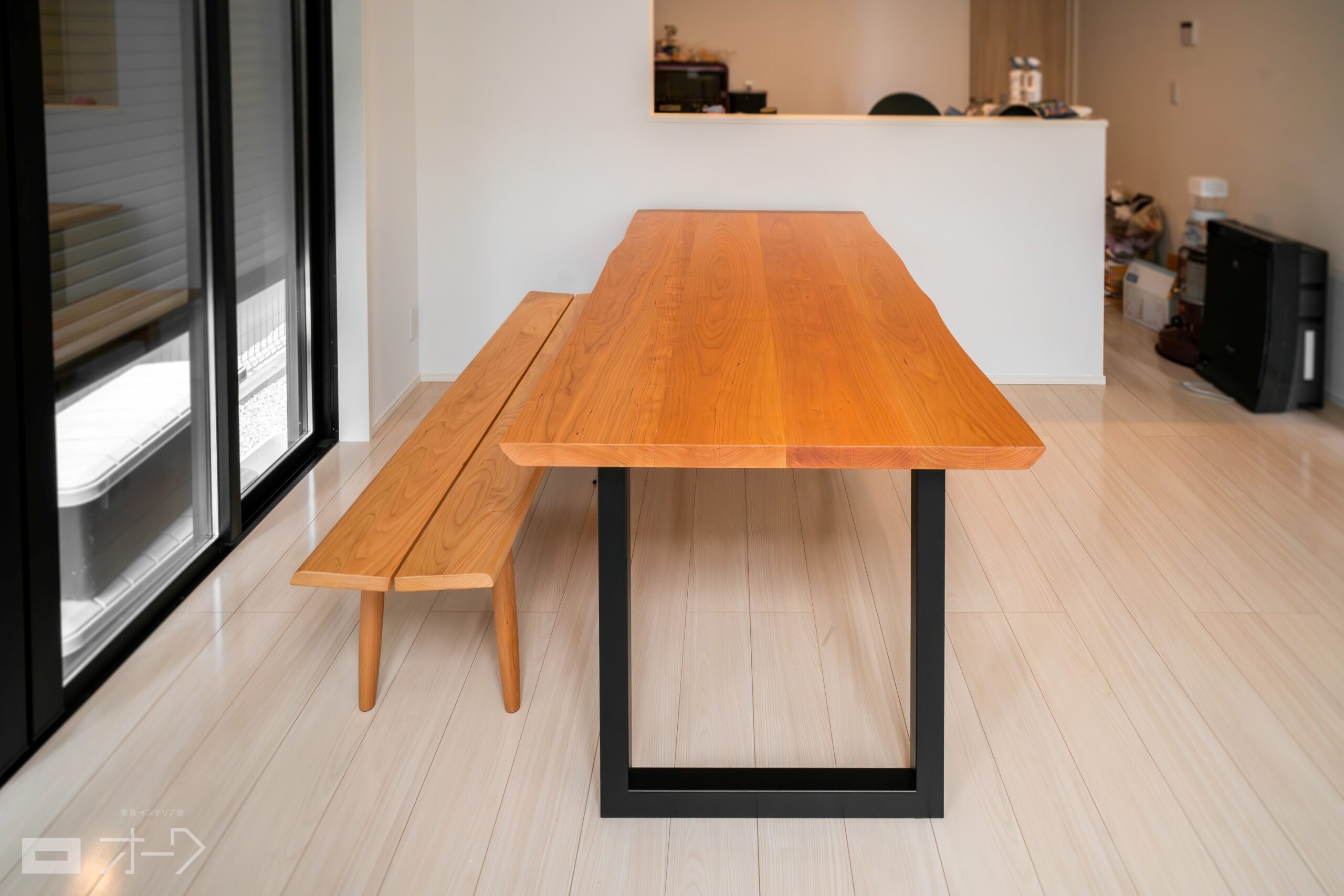 ブラックチェリー無垢材のダイニングテーブル・ベンチをお届けしました。広々としたダイニングスペースを活かして、幅1900㎜というかなりの大判サイズでのご用意です。40㎜の板厚に加えて、削り出しを入れたサイドの曲線が美しい一枚です。これから数年かけて、より深い色合いに経年変化していくのが楽しみな仕上がりになりました。