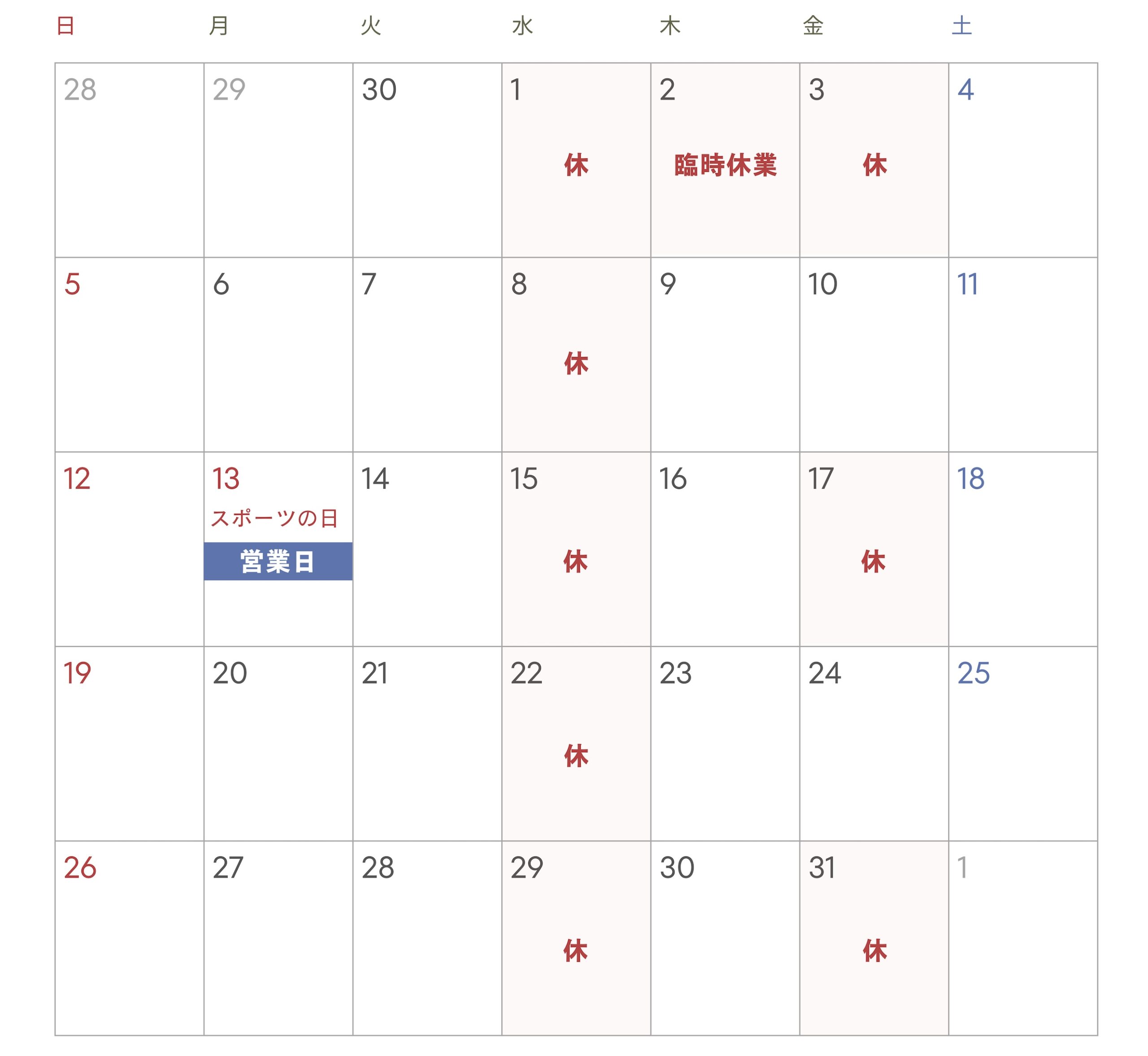 2025年10月中の営業日については下記の通りです。 (営業時間 – 12:00〜19:00)